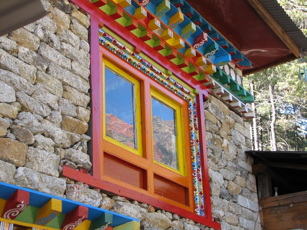 Colourful detail on the Buddhist temple in the village of Monjo in the Everest region of Nepal.