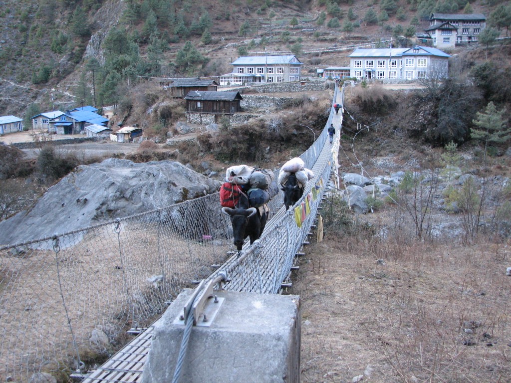 This is one of many suspension bridges we had to cross on our trek towards Everest in January 2006. This one is between the villages of Phakding and Monjo. Note the yaks crossing the bridge.